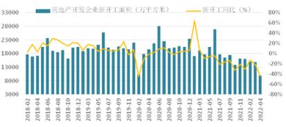 1-4月份,房屋新開工面積39739萬平方米,同比下降26.3%;從單月來看,自去年4月份開始,新開工面積持續(xù)負增長,今年4月份同比降幅由上月的22.2%擴大至44.2%,新開工下行明顯加快,對后期施工和行業(yè)的投資形成制約。