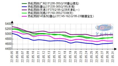 五月份國(guó)內(nèi)帶鋼市場(chǎng)基本呈現(xiàn)震蕩弱行態(tài)勢(shì)。帶鋼市場(chǎng)在月初受公共衛(wèi)生事件影響,鋼企復(fù)工復(fù)產(chǎn)積極性低迷,貿(mào)易商心態(tài)以謹(jǐn)慎觀望為主。市場(chǎng)隨著下游需求恢復(fù)緩慢,市場(chǎng)活躍度較低,成交量平平。但中旬隨著相關(guān)政策的出臺(tái),物流運(yùn)輸方面仍受限,加之焦炭第二輪提降落地,市場(chǎng)看空情緒加重。下旬伴隨各地疫情反復(fù),市場(chǎng)停滯狀態(tài)仍存。商貿(mào)迫于成本壓力挺價(jià)意愿濃厚,然需求寥寥,無(wú)奈小幅降價(jià)促進(jìn)成交。截止至5月31日,華北地區(qū)唐山小窄帶報(bào)價(jià)主流為4720元/噸,唐山355系窄帶鋼主流報(bào)價(jià)為4640元/噸,天津355系窄帶主流報(bào)價(jià)為4970元/噸,華東地區(qū)無(wú)錫355系窄帶主流報(bào)價(jià)為4850元/噸,華南地區(qū)廣州355系窄帶主流報(bào)價(jià)為4870元/噸。