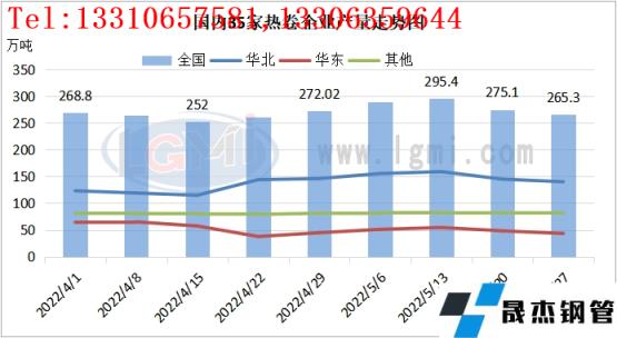 截止2022年5月27日,據(jù)云商平臺監(jiān)測數(shù)據(jù)顯示,國內(nèi)熱軋卷板社會庫存量約為243.71萬噸,環(huán)比增加10.72萬噸。重點(diǎn)城市庫存整體表現(xiàn)不一,華東、華南庫存小幅去庫,華北區(qū)域天津社會庫存有所累庫。具體來看,廣州地區(qū)熱卷社會庫存量約為61.91萬噸,環(huán)比減少3.05萬噸;上海熱卷社會庫存量環(huán)比減少0.21萬噸至41.84萬噸;天津熱卷社會庫存量約為7.20萬噸,環(huán)比增加1.58萬噸。