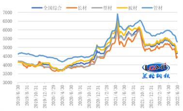 6月份,市場(chǎng)需求淡季特征較為明顯,北方高溫和南方雨季都影響了正常的施工節(jié)奏,下游實(shí)際采購(gòu)需求釋放力度受限嚴(yán)重,疊加成本支撐力度的減弱,國(guó)內(nèi)厚壁鋼管市場(chǎng)呈現(xiàn)明顯的弱勢(shì)下跌行情。據(jù)云商平臺(tái)監(jiān)測(cè)數(shù)據(jù)顯示,截至6月底,全國(guó)厚壁鋼管綜合價(jià)格為4672元,較上月末下跌412元,環(huán)比跌幅為8.1%,年同比下跌14.0%。其中,長(zhǎng)材價(jià)格為4452元,較上月末下跌404元,跌幅8.3%,年同比下跌11.9%;板材價(jià)格為4755元,較上月末下跌415元,跌幅為8.0%,年同比下跌16.5%;型材價(jià)格指數(shù)為4750元,較上月末下跌432元,跌幅為8.3%,年同比下跌12.8%;管材價(jià)格為5311元,較上月末下跌421元,跌幅為7.4%,年同比下跌11.4%(詳見(jiàn)圖1)。