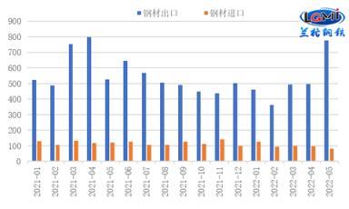 進(jìn)口方面,由于國(guó)內(nèi)疫情對(duì)制造業(yè)的沖擊仍存,且海外市場(chǎng)價(jià)格優(yōu)勢(shì)不足,進(jìn)口仍呈下降態(tài)勢(shì)。5月份,我國(guó)進(jìn)口厚壁鋼管80.6萬(wàn)噸,環(huán)比下降16.0%,同比下降33.2%;1-5月累計(jì)進(jìn)口厚壁鋼管498.0萬(wàn)噸,同比下降18.3%。