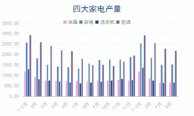 1-5月份,冰箱產(chǎn)量3401.0萬臺(tái),同比下降8.1%;彩電產(chǎn)量7441.0萬臺(tái),同比增長4.5%;洗衣機(jī)產(chǎn)量3471.7萬臺(tái),同比下降4.1%;空調(diào)產(chǎn)量9933.5萬臺(tái),同比下降0.8%。
