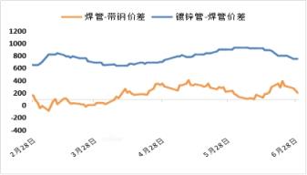 6月焊管較帶鋼價(jià)差由月初收至零軸后重新走擴(kuò),目前管廠廠內(nèi)原料輪換周期拉長至15天左右,結(jié)算周期內(nèi)焊管生產(chǎn)利潤平均虧損139元,架子管平均虧損129元;鍍鋅管較焊管價(jià)差擴(kuò)大96元,綜合生產(chǎn)利潤有所改善,但整體仍處虧損邊緣。