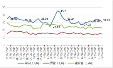 焊鍍管廠產(chǎn)能利用率靈活下降。6月在統(tǒng)計(jì)管廠總產(chǎn)量145.46萬噸,月比增產(chǎn)7.51萬噸,月中下旬產(chǎn)能利用率逐步下降至60%左右,周末倒班減產(chǎn),整體在統(tǒng)計(jì)管廠影響產(chǎn)量在14萬噸上下,占總產(chǎn)量的22.7%。截至6月23日,天津唐山邯鄲主流管廠廠內(nèi)總體庫存68.01萬噸,比上月增1.86萬噸。進(jìn)入6月,疫情形勢(shì)好轉(zhuǎn),主導(dǎo)管廠協(xié)議原料陸續(xù)到庫,但行情突降,生產(chǎn)利潤進(jìn)入洼地,管廠快速調(diào)整產(chǎn)能應(yīng)對(duì),引導(dǎo)供需向再平衡過渡,整體來看,博弈階段仍存一定壓力(見圖4)。