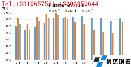 粗鋼產量與高爐開工情況走勢高度一致,受粗鋼減壓等因素影響,今年上半年我國粗鋼產量1-6累計粗鋼產量52688萬噸,同比下降6.5%;累計生鐵產量43893萬噸,同比下降4.7%;累計厚壁鋼管產量66714萬噸,同比下降4.6%。整體來看,今年上半年粗鋼產量最低值出現(xiàn)在2月份為7496萬噸,最高值出現(xiàn)在5月份為9661萬噸,6月份高位回落至9073萬水平。