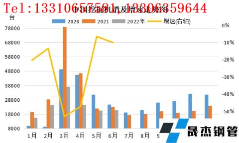 挖掘機銷量同比下滑明顯。據(jù)中國工程機械工業(yè)協(xié)會行業(yè)數(shù)據(jù)顯示,2022年上半年共銷售各類挖掘機143094臺,同比下降36.1%。其中,國內市場銷量91124臺,同比下降52.9%;出口銷量51970臺,同比增長72.2%。分月度數(shù)據(jù)來看,最高值出現(xiàn)在3月份,挖掘機銷量為37085臺,同比仍存53.1%跌幅,其中國內銷量26556臺,同比減少63.6%;出口10529臺,同比增長73.5%。最低點出現(xiàn)在1月份,銷量為15607臺,同比下降20.4%??梢钥吹降氖牵?022年6月份挖掘機銷量同比降幅大幅收窄,主要得益于封閉管控對物流運輸造成的影響減弱,以及穩(wěn)增長政策落地顯效,挖掘機國內銷量有所改善。