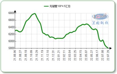 據(jù)云商平臺(tái)監(jiān)測(cè)數(shù)據(jù)顯示:截至7月29日,國內(nèi)十大主導(dǎo)城市108*4.5無縫管市場(chǎng)均價(jià)5805元,較上月同期跌205元。