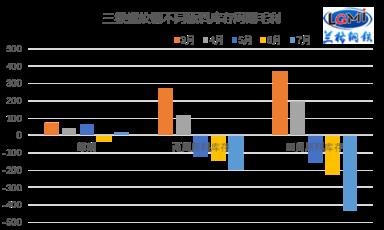 7月份由于原料庫存周期不同,成本下降幅度有明顯差異,厚壁鋼管市場均值震蕩下行,7月份品種噸鋼毛利相比上月表現(xiàn)分化。以三級螺紋鋼為例,以即期原料成本測算7月份毛利空間較上月上升49元/噸,由虧轉(zhuǎn)盈;而以兩周、四周原料庫存周期測算7月份毛利空間均在虧損區(qū)間繼續(xù)下行,兩周原料庫存周期測算虧損幅度較上月擴(kuò)大53元/噸,以四周原料庫存周期測算7月份虧損空間較上月擴(kuò)大206元/噸(詳見圖2)。