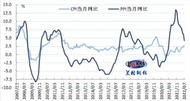 7月份,工業(yè)生產(chǎn)者出廠價格同比漲幅較上月回落1.9個百分點,同比漲幅回落速度加快,環(huán)比自今年2月份以來首次下降,且降幅較大。海外主要經(jīng)濟體經(jīng)濟增速放緩,貨幣政策持續(xù)收緊,需求收縮壓力加大,后期PPI同比漲幅將保持回落趨勢。