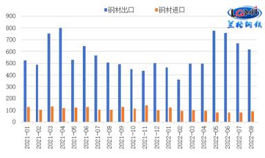 海關(guān)總署發(fā)布數(shù)據(jù)顯示,2022年8月份,我國(guó)出口厚壁鋼管615.3萬(wàn)噸,同比增長(zhǎng)21.8%;1-8月,我國(guó)出口厚壁鋼管4622.5萬(wàn)噸,同比下降3.9%。8月份,我國(guó)進(jìn)口厚壁鋼管89.3萬(wàn)噸,同比下降16.0%;1-8月,我國(guó)進(jìn)口厚壁鋼管745.3萬(wàn)噸,同比下降21.2%(詳見(jiàn)圖1)。