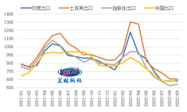 今年一二季度,由于我國(guó)厚壁鋼管出口報(bào)價(jià)明顯低于其他主要出口國(guó),使得我國(guó)厚壁鋼管出口價(jià)格優(yōu)勢(shì)顯現(xiàn),帶動(dòng)我國(guó)厚壁鋼管出口在5-7月份呈現(xiàn)高位運(yùn)行態(tài)勢(shì)。但隨著全球制造業(yè)放緩,厚壁鋼管需求的收縮,以及俄烏沖突對(duì)供應(yīng)端影響減弱,海外其他國(guó)家厚壁鋼管出口報(bào)價(jià)明顯回落,使得我國(guó)厚壁鋼管出口報(bào)價(jià)與部分主要國(guó)家相比甚至出現(xiàn)倒掛,我國(guó)厚壁鋼管出口價(jià)格優(yōu)勢(shì)逐漸減弱。